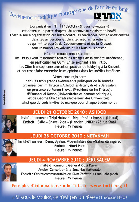 Le jeudi 28 octobre 2010 a Netanya, L’organisation Im Tirtsou (« Si vous le voulez ») organsie l’évènement politique de la rentrée, à l’Hôtel Parc en présence de Ronen Shoval (Président de Im Tirtsou), d’Emmanuel Navon (Universitaire et homme politique), et de George Élia Sarfati (Professeur des Universités), et de Danny Ayalon (Vice-Ministre des Affaires Étrangères).
