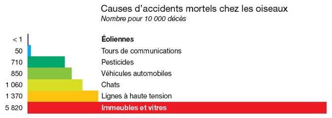 Une étude américaine avait établit que les immeubles tuent 19.000 fois plus d’oiseaux que les éoliennes. Sur 10.000 décès, 5.820 oiseaux ont heurté un immeuble ou une vitre et 1.370 ont téléscopé une ligne à haute tension. La troisième cause de mortalité, ce sont …les chats. Les éoliennes arrivent en fin de classement, avec 0,3 décès sur les 10.000. Les immeubles causent donc 19.000 fois plus de décès que les éoliennes (1)