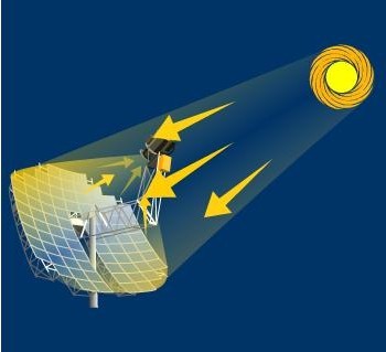 l’énergie solaire est concentrée grâce à un miroir parabolique vers des cellules photovoltaïques sans silicium, à base d’Arséniure de Gallium, qui résiste aux hautes températures. Ce système de concentration fait baisser le coût du kWh…jusqu’à devenir compétitif avec les énergies sales comme le charbon !