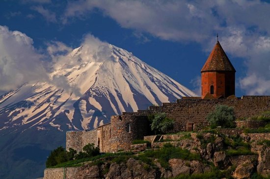 Symbole national qui culmine à 5 165 mètres d’altitude, bien au-dessus de notre Mont Blanc, le mythique Mont Ararat est pourtant situé en Turquie voisine, honnie justement pour sa responsabilité dans le génocide arménien de 1915. Par une justice divine peut-être, le meilleur point de vue pour en admirer la silhouette parfaite se trouve en Arménie. Ce volcan au sommet recouvert de neiges éternelles fut autrefois sur le territoire de l’Arménie historique. C’est ici que se serait échouée l’arche de Noé. La vue sur le Mont Ararat depuis le monastère de Khor Virap est l’une des cartes postales du pays.