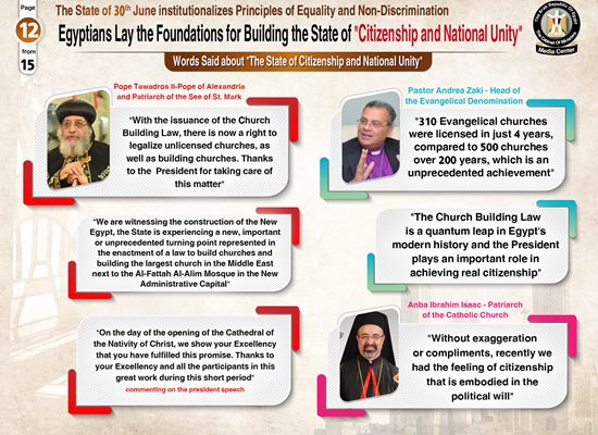 À cet égard, le Centre des médias du cabinet égyptien a publié un rapport détaillé comprenant des infographies mettant en évidence les efforts et les piliers de la construction de l’état de citoyenneté et de l’unité nationale en Égypte et de la consolidation des principes d’égalité et de non-discrimination depuis la révolution du 30 juin.