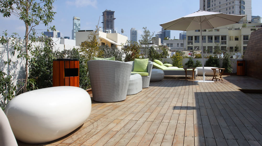 Envie de cigarette, il faut à aller sur le superbe toit ( en photo) ou dans le patio du jardin tout en profitant du soleil de Tel-Aviv qui brille quasiment toute l’année.