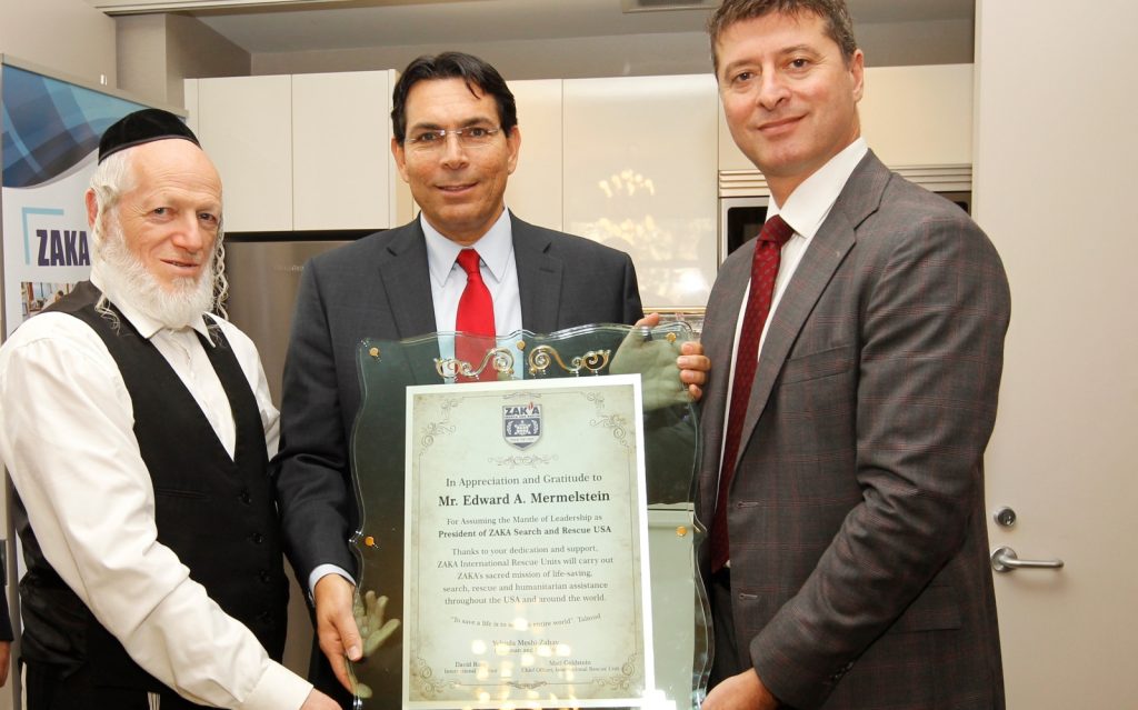 De gauche à droite, le fondateur et président de ZAKA, Yehuda Meshi-Zahav, l’ambassadeur d’Israël auprès de l’ONU Danny Danon et le président de ZAKA Search & Rescue USA Edward Mermelstein